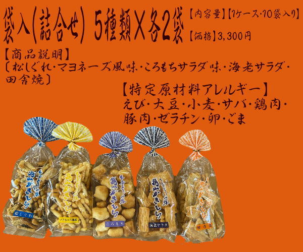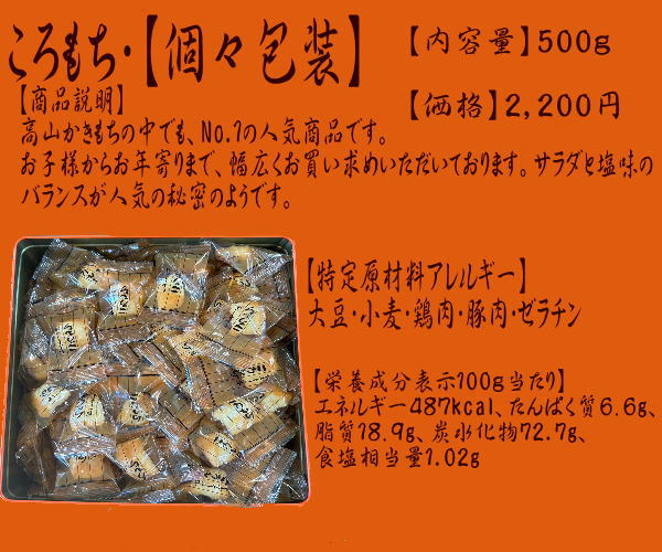 成分・原材料 餅米(国産)、植物油脂、食塩、粉末しょうゆ、ほたてエキス、昆布エキス、チキンスープシーズニング/調味料(アミノ酸等)、加工デンプン、香辛料抽出物、 (一部に小麦・大豆・鶏肉・豚肉・ゼラチンを含む) ころもち (ばら詰め)850g 2,200円 (袋詰め) 500g 2,200円 |